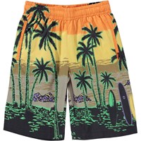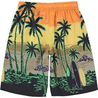 Adi is een biologische Hawaii short in oranje en geel met een print van neonkleurige palmbomen. Het heeft een elastische tailleband en steekzakken. Draag het met een bijpassende t-shirt.