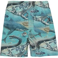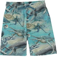 Alim is een blauwe short van biologisch katoen met een print van prehistorische dieren die onder het wateroppervlak leven. Deze short heeft een elastische tailleband met koordjes en twee voorzakken en een enkele opgestikte achterzak.