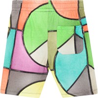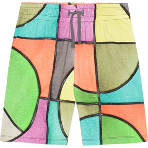 Een short van biologisch katoen met een kleurrijke basketbalprint. De short valt op knielengte en heeft een normale pasvorm met een verstelbare elastische taille. Het heeft steekzakken in de zijnaad en een enkele achterzak.