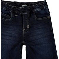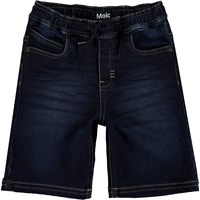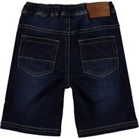Ali is een donkerblauwe korte spijkerbroek met een comfortabele en losse pasvorm. Het heeft een elastische taille die wordt aangepast met koordjes.