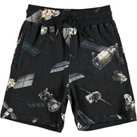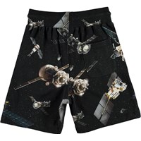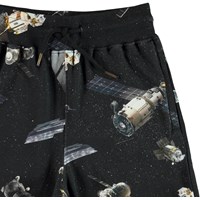 Alw is een zwarte sweatshort met een all-over print van satellieten die in de ruimte rondvliegen. Alw heeft een brede elastische taille met koordjes.