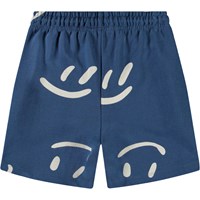 Short van biologisch katoenen jersey. De short is knielang, heeft zakken aan de voorkant en een ruimvallende pasvorm met een elastische taille, waardoor het comfortabel is om te dragen. De short is blauw en heeft een print van smiley's. Voor een complete outfit combineer je het met de bijpassende sweater.