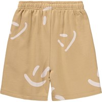Beige shorts met een print van lachende gezichten gemaakt van zacht biologisch katoenen jersey. Het model heeft een elastische taille met een verstelbaar koordje, zijzakken en een ruimvallende en relaxte pasvorm.