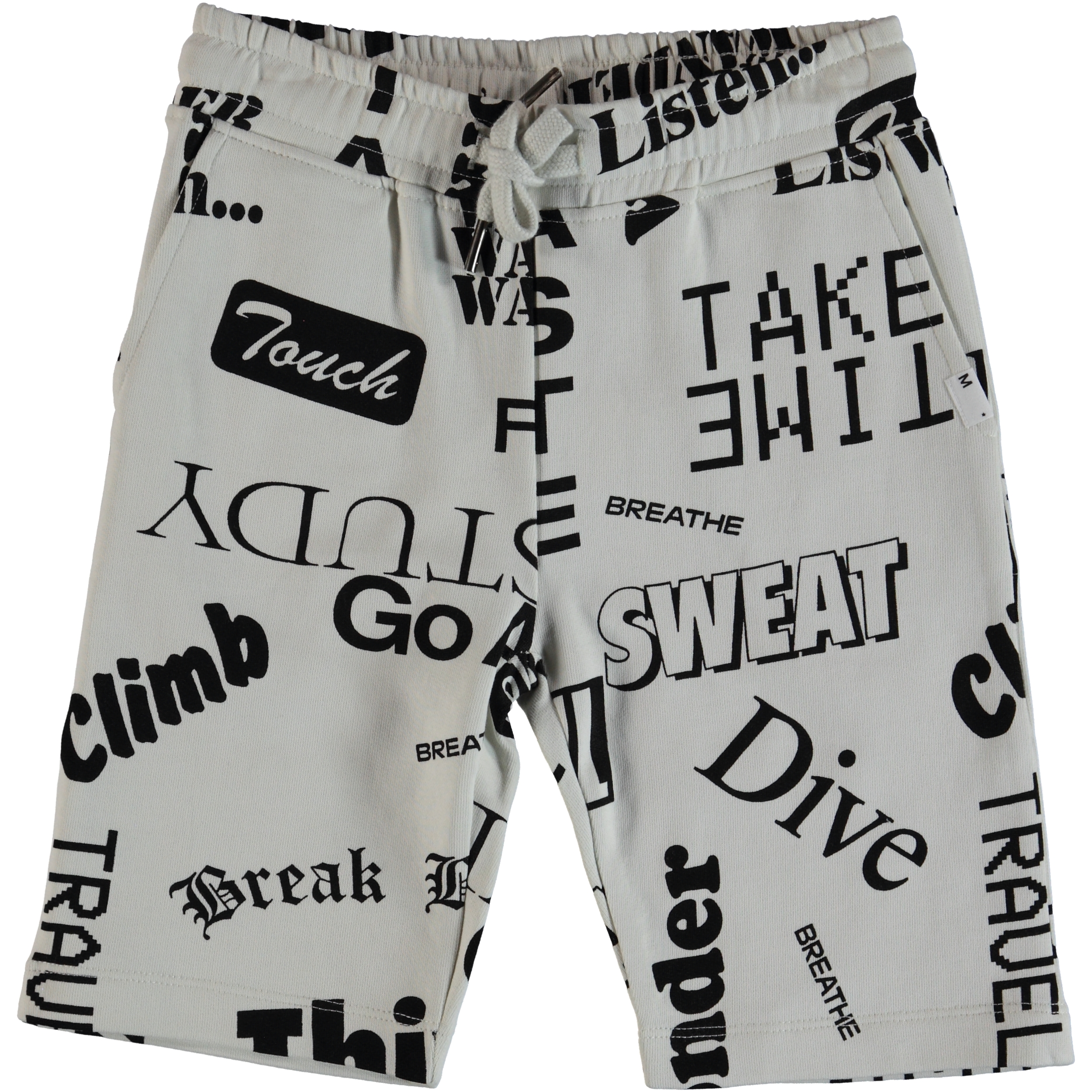Arnt is een katoenen short met veel attitude in de "Word" -print. Het heeft een elastische taille met koordjes en voorzakken.