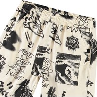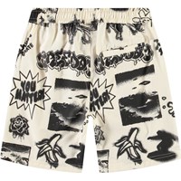 Knielange short van biologisch katoen. De short heeeft een elastische taille, zakken aan de zijkanten, een achterzak en een ruimvallende baggy pasvorm. Het is beige met een print geinspireerd op de skaterwereld en stoere leuzen. Combineer het met een bijpassend shirt voor een stoere outfit.