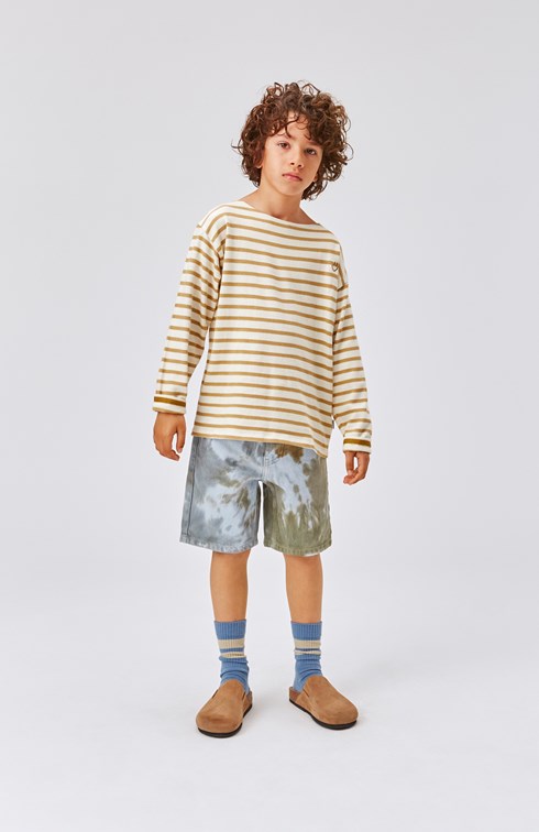 Avian is een korte spijkerbroek met een tie-dye print in de kleuren groen en blauw. Het heeft voor- en achterzakken en een leren patch met het Molo logo. Al Molo’s tie-dye prints zijn handgemaakt, dus elk kledingstuk is uniek.