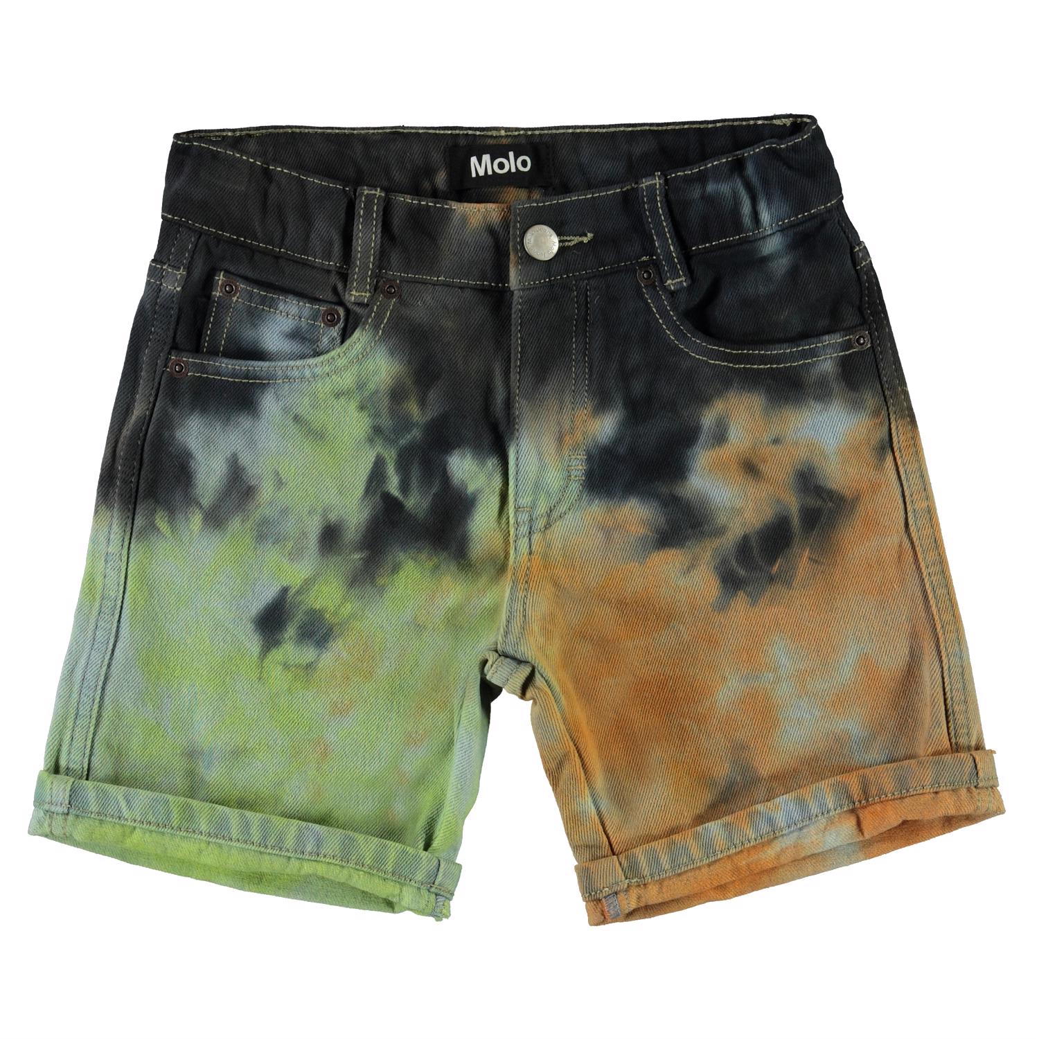 Avian is een korte donkere jeans met groen en oranje tie-dye . Het heeft omgeslagen pijpen. Avian is van 100% katoen.