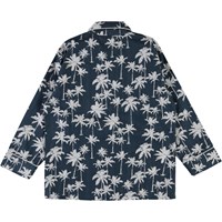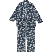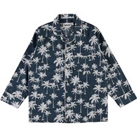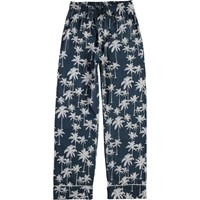 Pyjama in blauw met een print van grijze palmbomen. De broek heeft koordjes in de taille en de top heeft lange mouwen.
