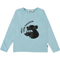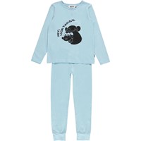Pyjama in lichtblauw met print op de voorkant van de top. De broek heeft koordjes in de taille en de top heeft lange mouwen.