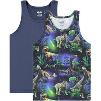 Duopak van hemdjes met brede bandjes en ronde hals gemaakt van zacht biologisch katoen. De set bevat één donkerblauwe en één met een dinosaurusprint. Combineer dit met de bijpassende boxershorts voor een complete set.