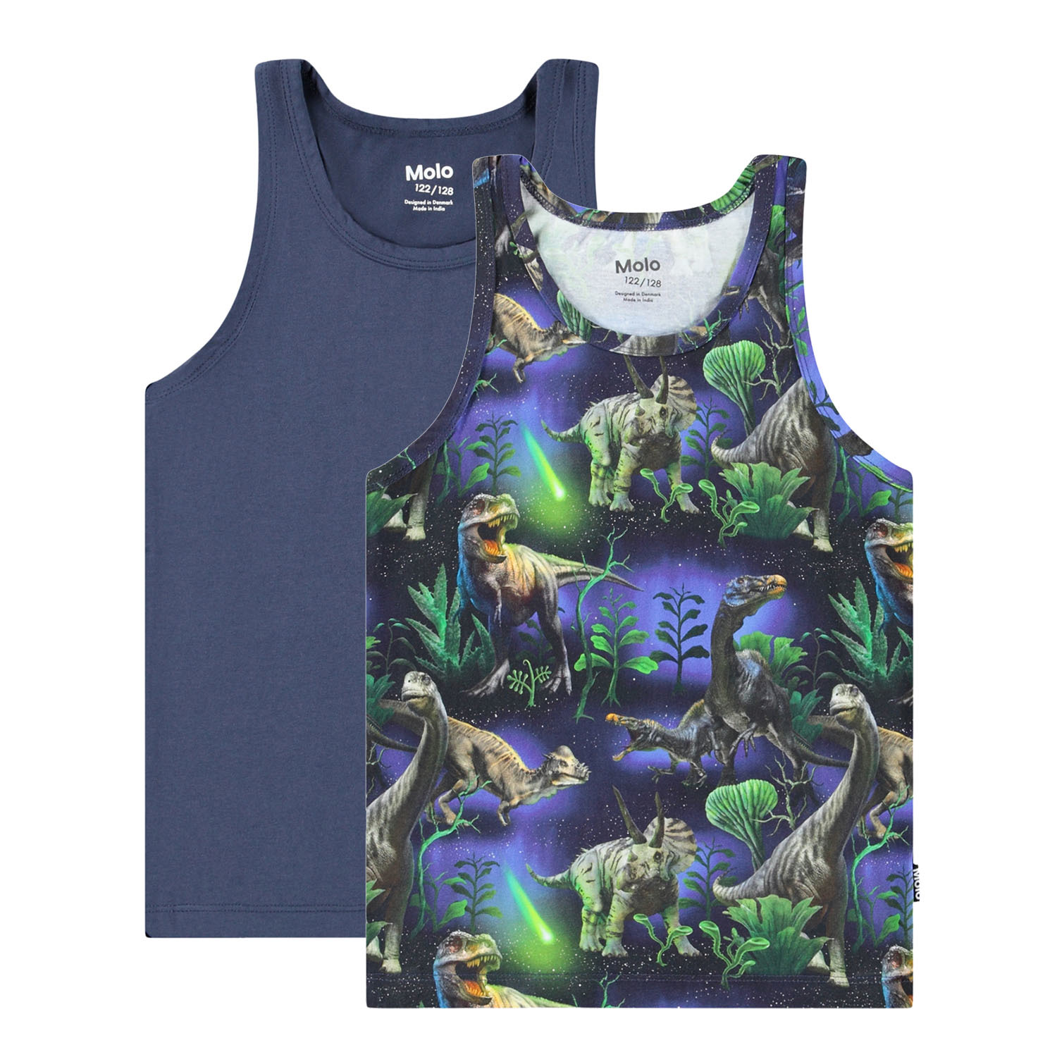 Duopak van hemdjes met brede bandjes en ronde hals gemaakt van zacht biologisch katoen. De set bevat één donkerblauwe en één met een dinosaurusprint. Combineer dit met de bijpassende boxershorts voor een complete set.