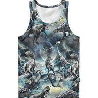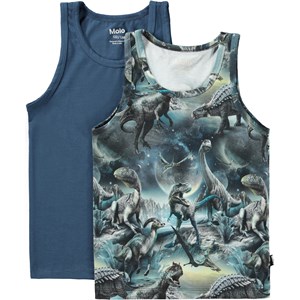 Duopak hemdjes van biologisch katoen. De set bevat een donkerblauw hemdje en een met een levendige all-over print van dinosaurussen.