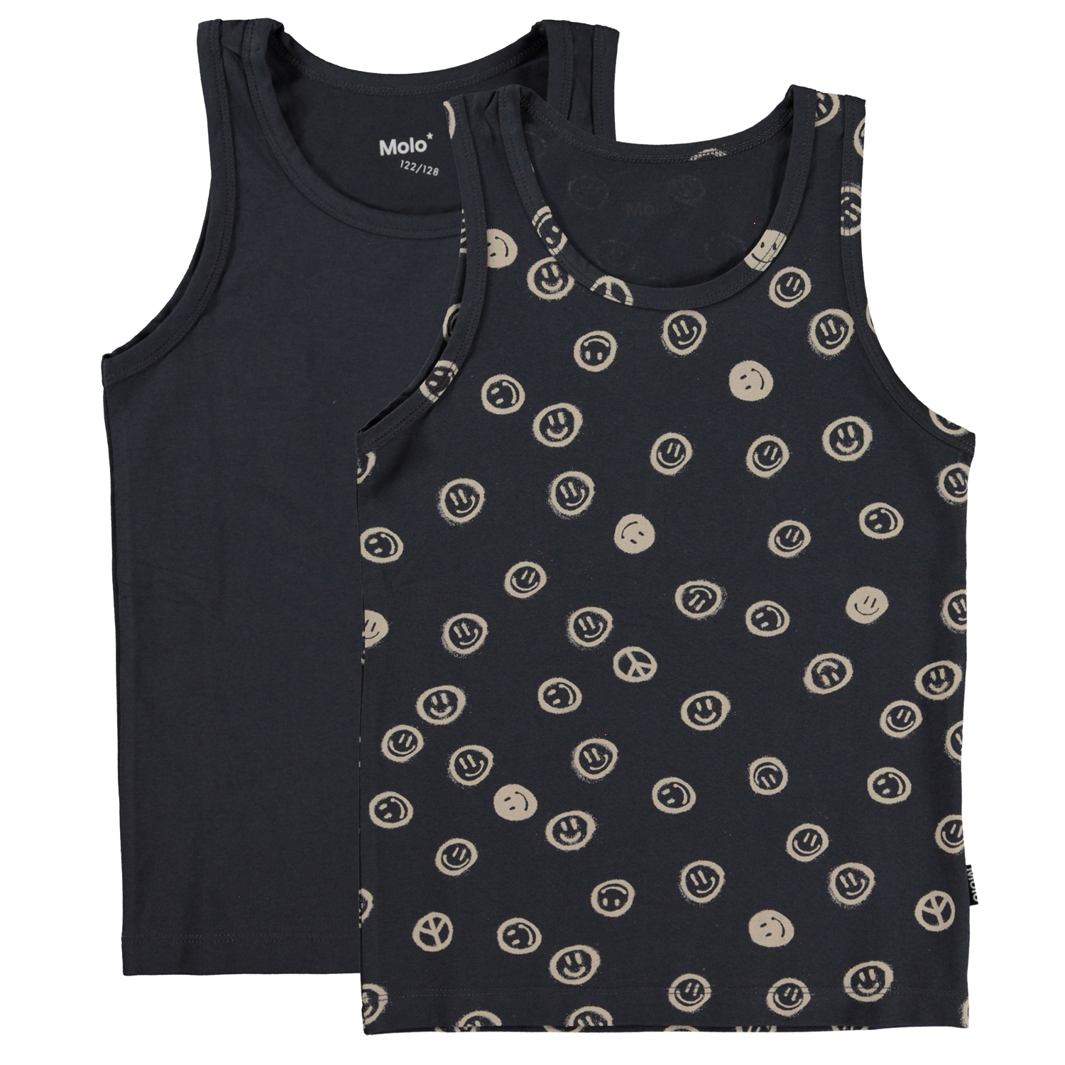 Duo pak van onze populaire Jayden hemden. Deze versie heeft een zwarte en een met een print. De print is beige en laat een heleboel kleine smiley’s en peace tekens zien. De hemden zijn gemaakt van 100% zachte katoenen jersey. Je kunt deze set van 2 hemden matchen met onze Justin duo pak, die bijpassende boxershorts zijn.