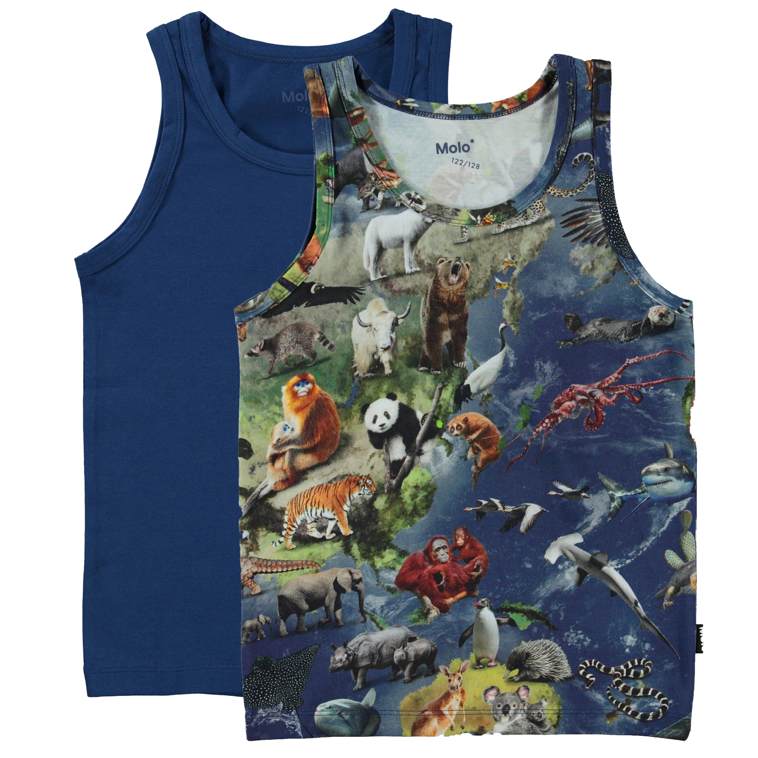 Pak van twee hemdjes van biologisch katoen. Het ene hemdje is in donkerblauw en het andere is in een print van de continenten van de Aarde met de dieren die daar leven.