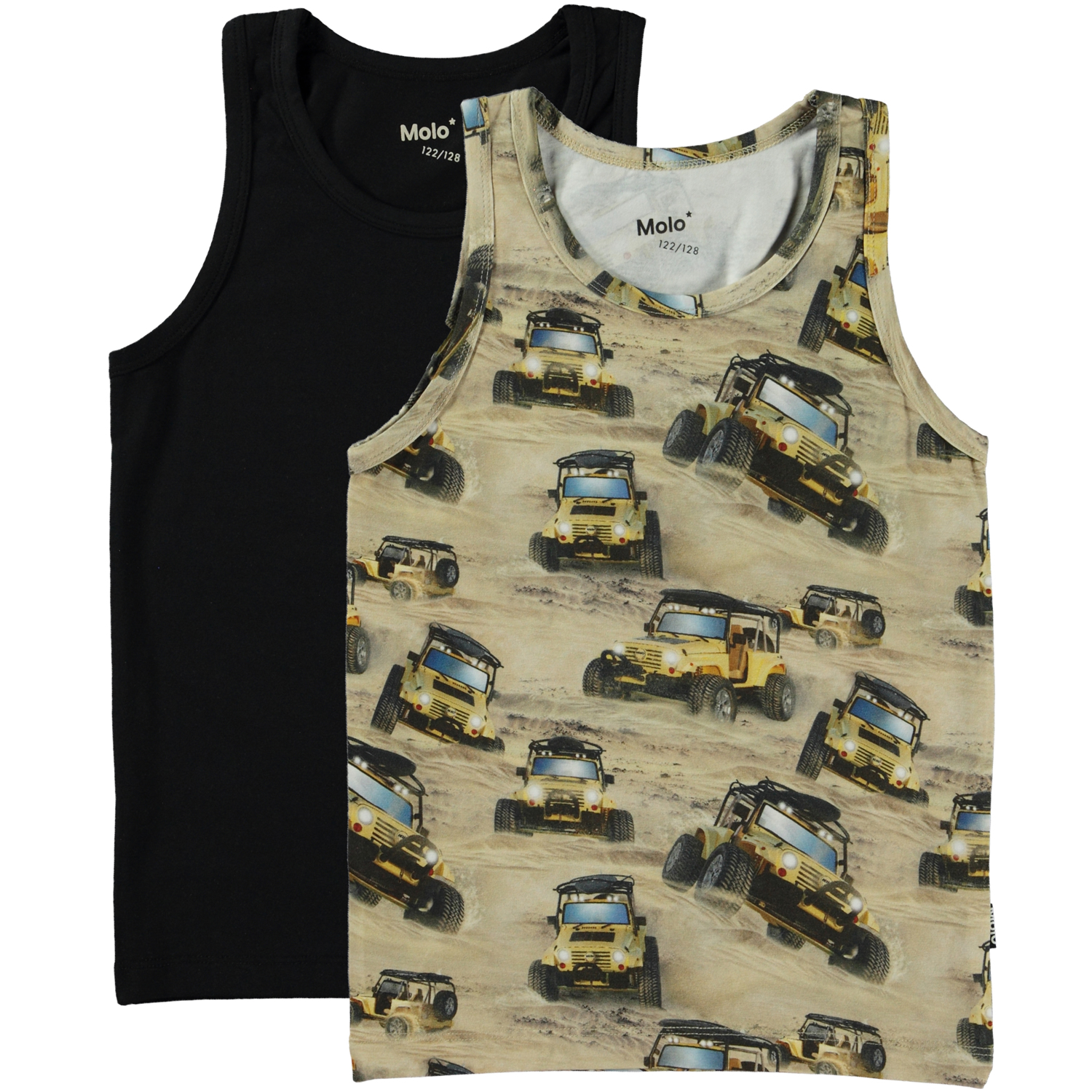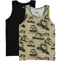 Pak van twee hemdjes van biologisch katoen. De ene is in het zwart en de andere is in een print van een jeep in de woestijn.
