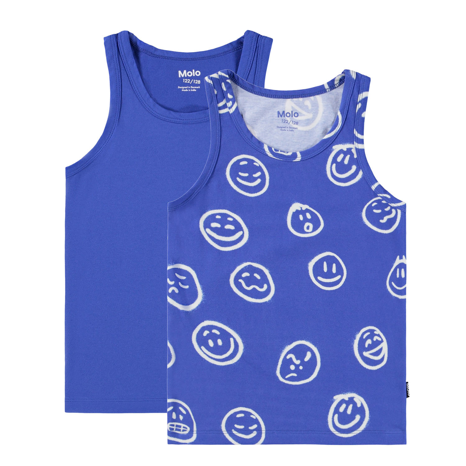 Duopak van hemdjes met brede bandjes en ronde hals gemaakt van zacht biologisch katoen. De set bevat een blauwe en een met een print van lachende gezichten. Combineer het met de bijpassende boxershorts voor een complete set.