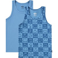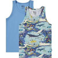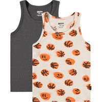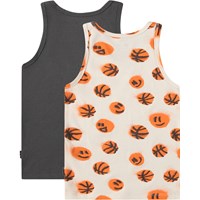 Duopak hemden gemaakt van zacht biologisch katoen met brede schouderbandjes en ronde hals. De verpakking bevat één grijze en één beige met een print van lachende basketballen.