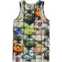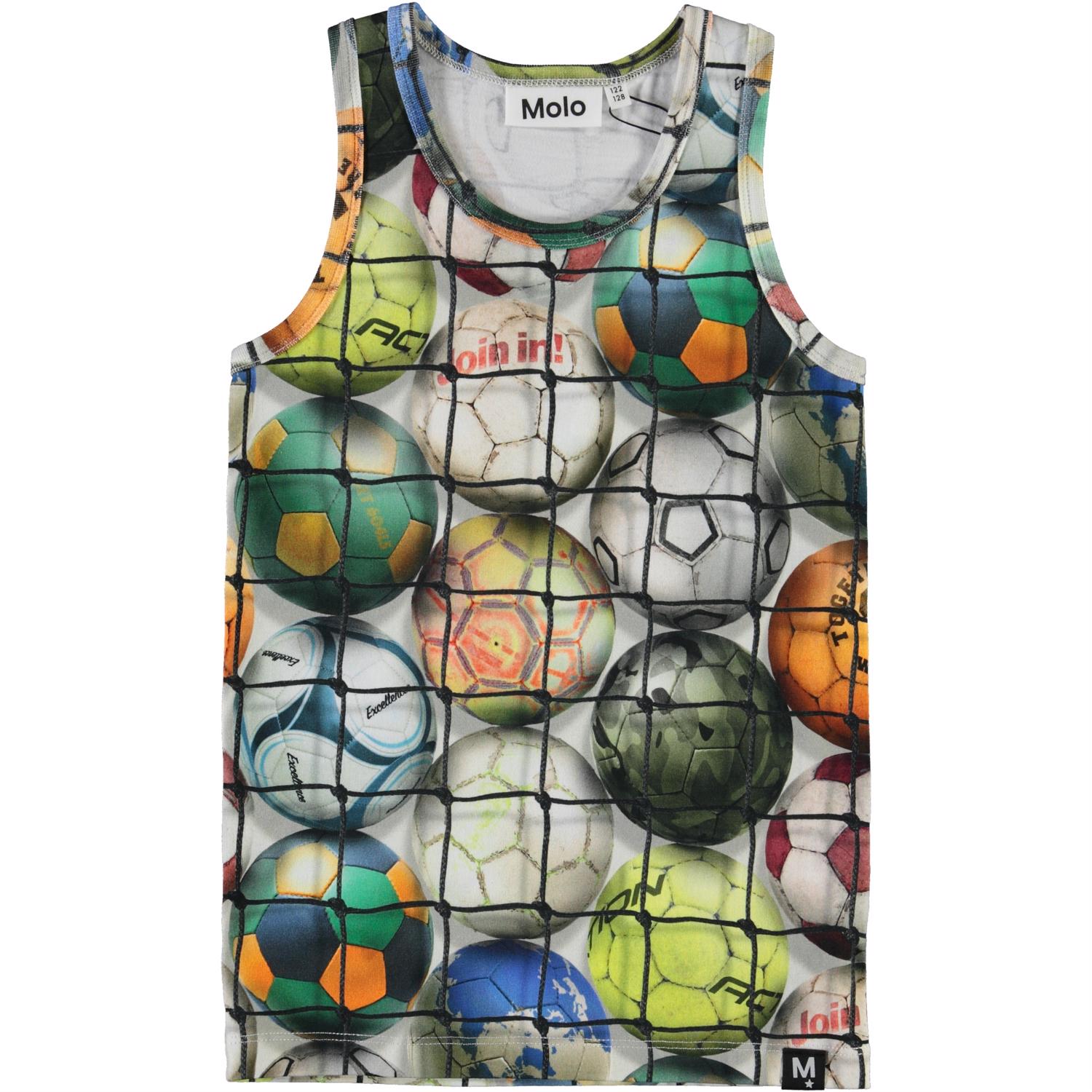 Jim is een hemd met een print van kleurrijke voetballen achter een net.