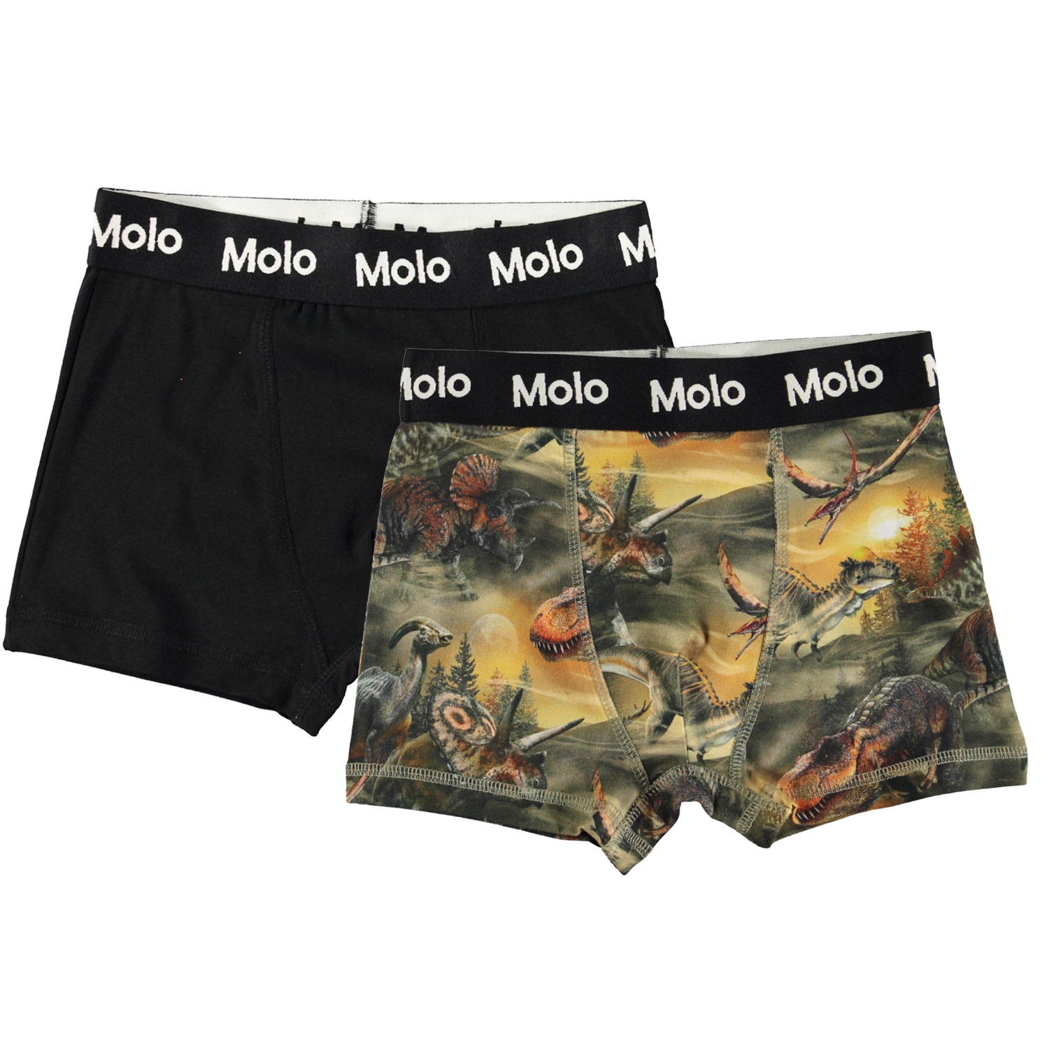 Duo pak van onze populaire Justin boxershorts. Deze versie heeft één zwart paar en één met een dinosaurus print. De print toont veel verschillende dinosaurussen die ronddwalen op de zandduinen in de ochtendmist. Er is een omtrek van de maan boven hen die hen eraan herinnert dat ze deel uitmaken van iets veel groters. De boxershorts zijn gemaakt van 100% zacht katoenen jersey en hebben een brede elastische taille met een zwart-wit Molo logo. Je kunt deze duo pak boxershorts matchen met onze Jayden duo pak, dit zijn bijpassende hemden.