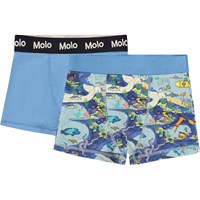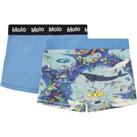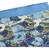 Duopak boxershorts gemaakt van zacht biologisch katoen met een brede elastische tailleband voor een comfortabele pasvorm. De verpakking bevat één blauwe boxershort en één gepixeld patroon van grappige vissen en fantasierijke figuren.