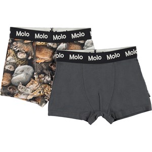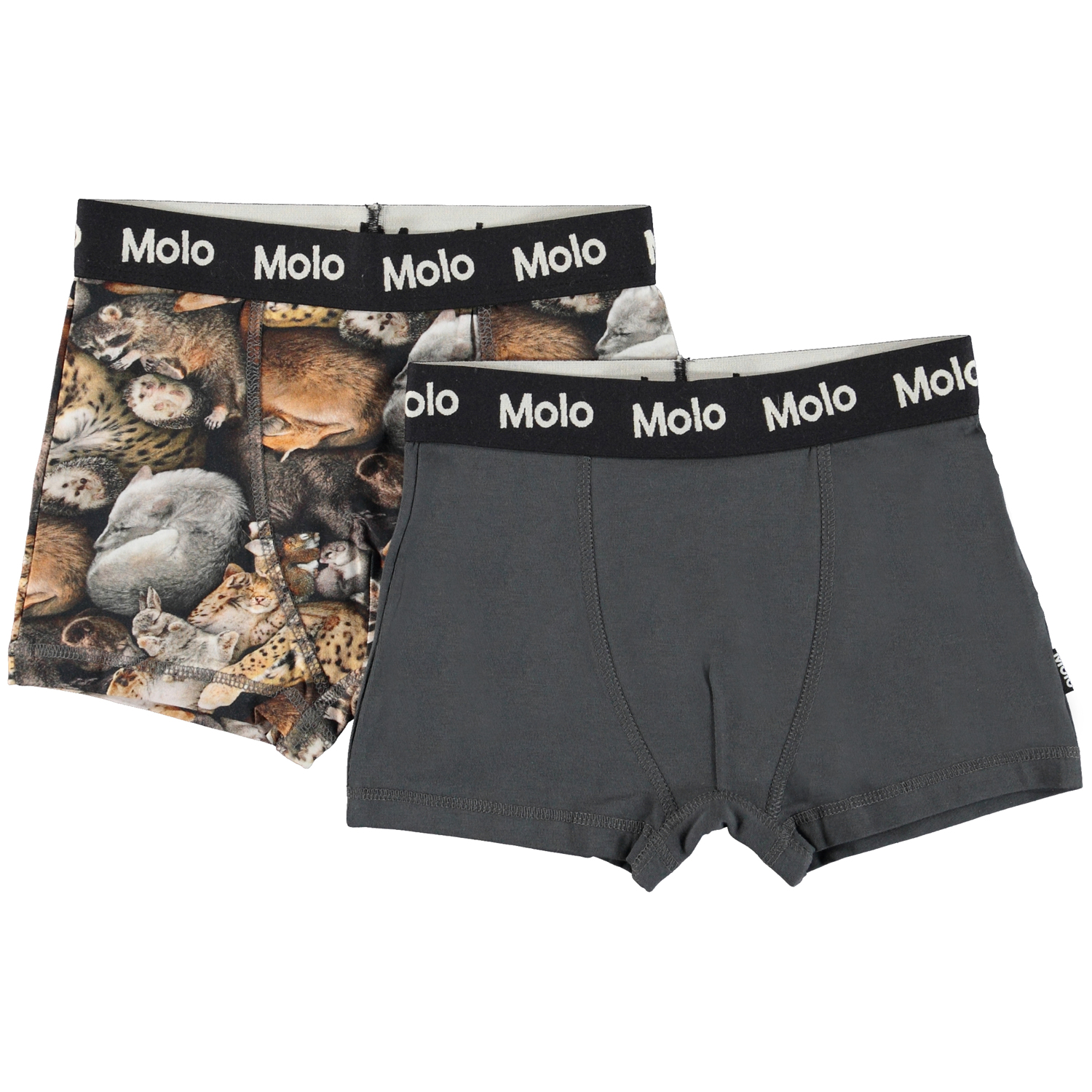 Pak met twee paar boxershorts. Een is grijs en de andere heeft een print van slapende dieren. De boxershort heeft een brede elastische boord voor een comfortabele pasvorm.