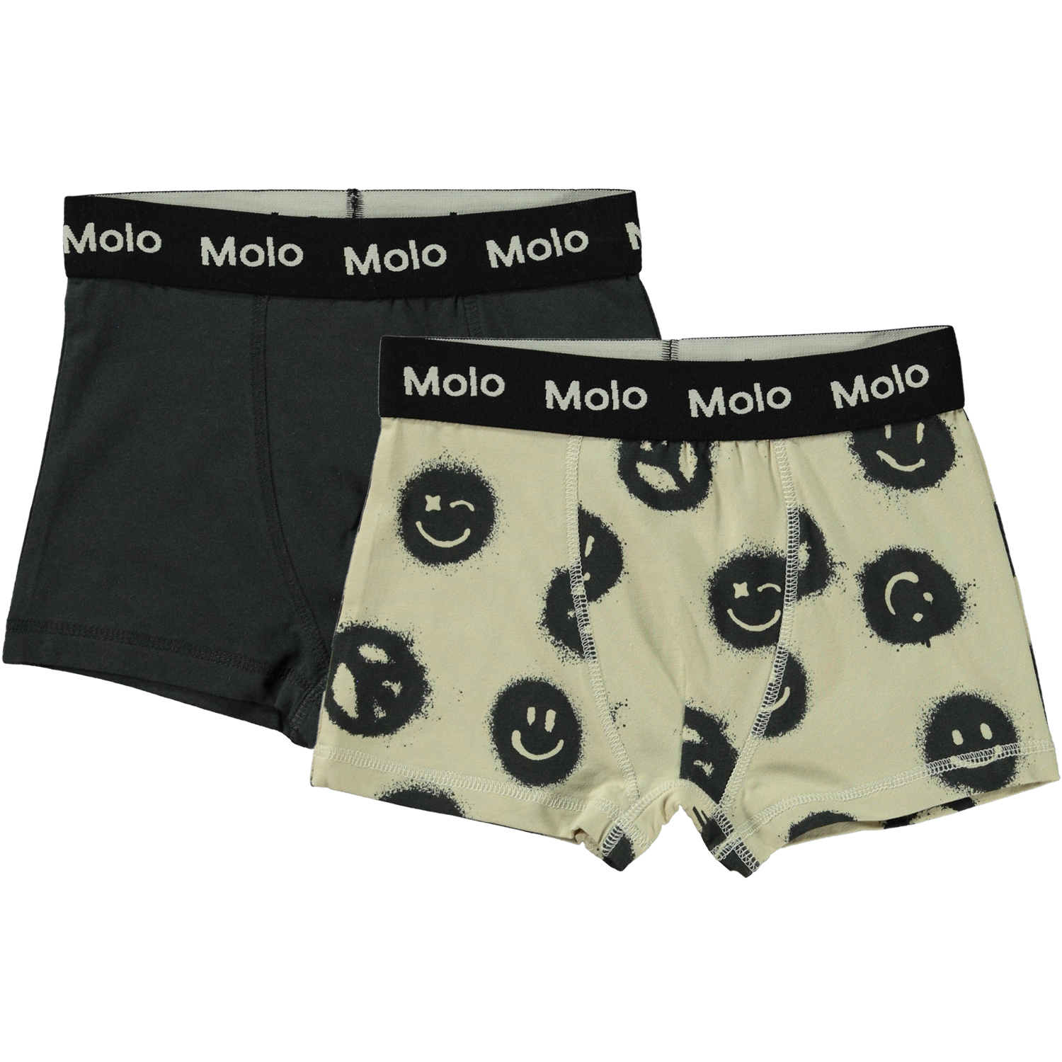Set van 2 boxershorts van biologisch katoen. Het ene paar is zwart en het andere paar is zandkleurig met een print van vredestekens en smileys. De boxershorts hebben een brede elastische tailleband voor een comfortabele pasvorm.