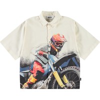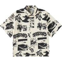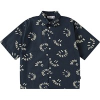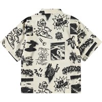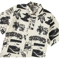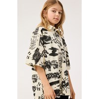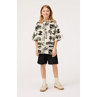 Beige overhemd van zacht biologisch katoen met wijde korte mouwen, klassieke kraag en knopen aan de voorkant. Het overhemd heeft een ruimvallende pasvorm en een zwarte all over print van de thema's van de collectie zoals aliens, force of nature, surfen, bananen, peace enz.
