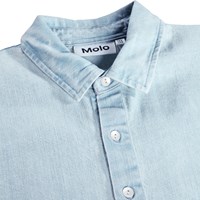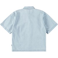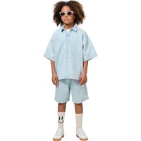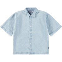 Lichtblauw spijkerblouse gemaakt van zachte biologische katoen met wijde T-shirtmouwen, een klassieke overhemdkraag, een knoopsluiting aan de voorkant en in een relaxte, oversized pasvorm.