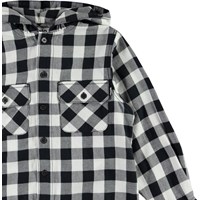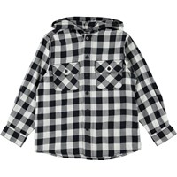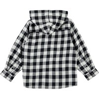 Rizz is een zwart, wit en grijs geblokte blouse met capuchon. De blouse heeft een knoopsluiting aan de voorzijde en zakken op de borst.