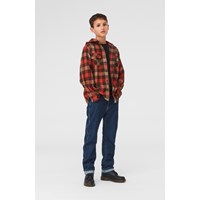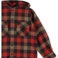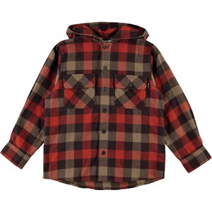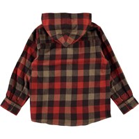 Rizz is een rood en bruin geblokte blouse met capuchon. De blouse heeft een knoopsluiting aan de voorzijde en zakken op de borst.