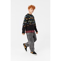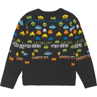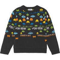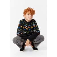Zwarte trui met lange mouwen en een ronde hals en geribbelde boorden. Het heeft een normale pasvorm en een mooie kleurrijke print, geïnspireerd op ouderwetse pixel- en schermgraphics met knipogen naar klassieke arcade-spellen en Tetris. Kleine figuurtjes verschijnen bovenaan en bewegen naar beneden.