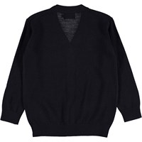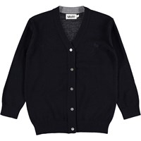 Donkerblauwe fijn gebreide vest in wol met simpele knopen aan de voorkant en ribboord aan de mouwen en onderkant.