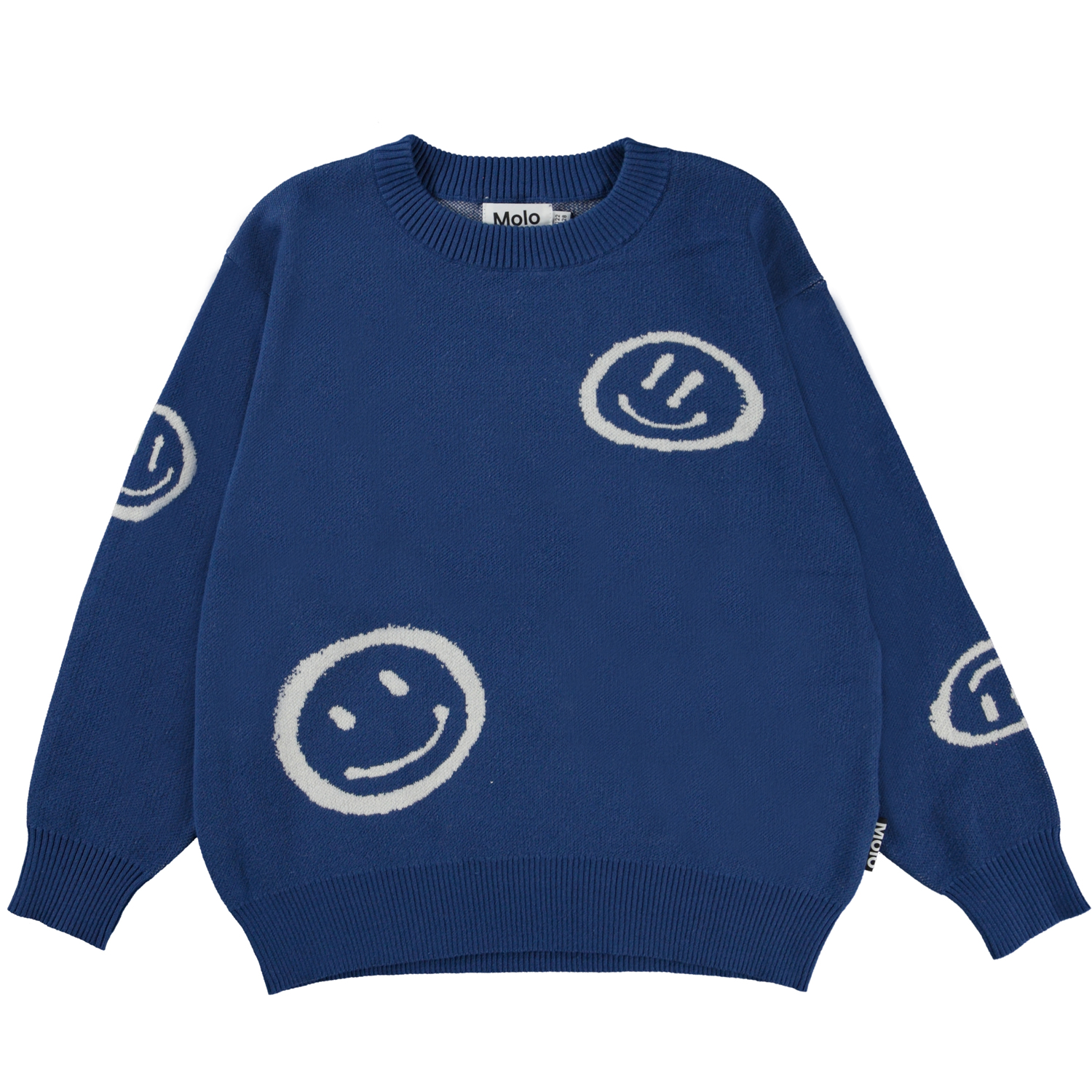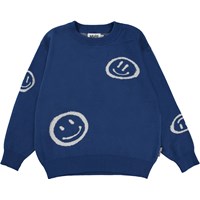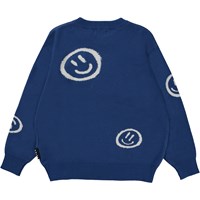 Bello is een donkerblauw gebreide trui met smileys. Het heeft een ribboord rond de hals, mouwen en onderkant.