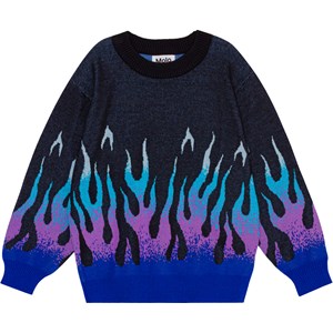 Donkergrijze gebreide biologische trui met een grafische vlammenmotief dat begint onderaan de mouwen en het lijf en omhoog beweegt in verschillende kleuren, variërend van blauw tot paars en turquoise, om de illusie van een klimmend vuur te creëren. De trui heeft een ruimvallende pasvorm en heeft een ronde hals met ribboord en een ribboord rond de mouwen en onderkant.