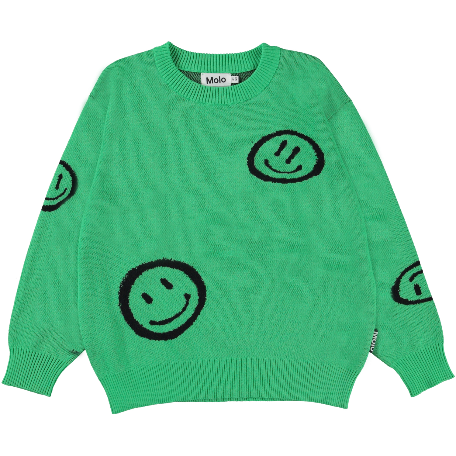 Bello is een groen gebreide trui met smileys. Het heeft een ribboord rond de hals, mouwen en onderkant.