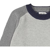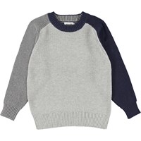 Boss is een gebreide lichtgrijze katoenen trui met een donkergroene en donkerblauwe mouw. De achterkant is blauw. De gebreide trui heeft ribboord aan de hals, mouwen en onderkant.