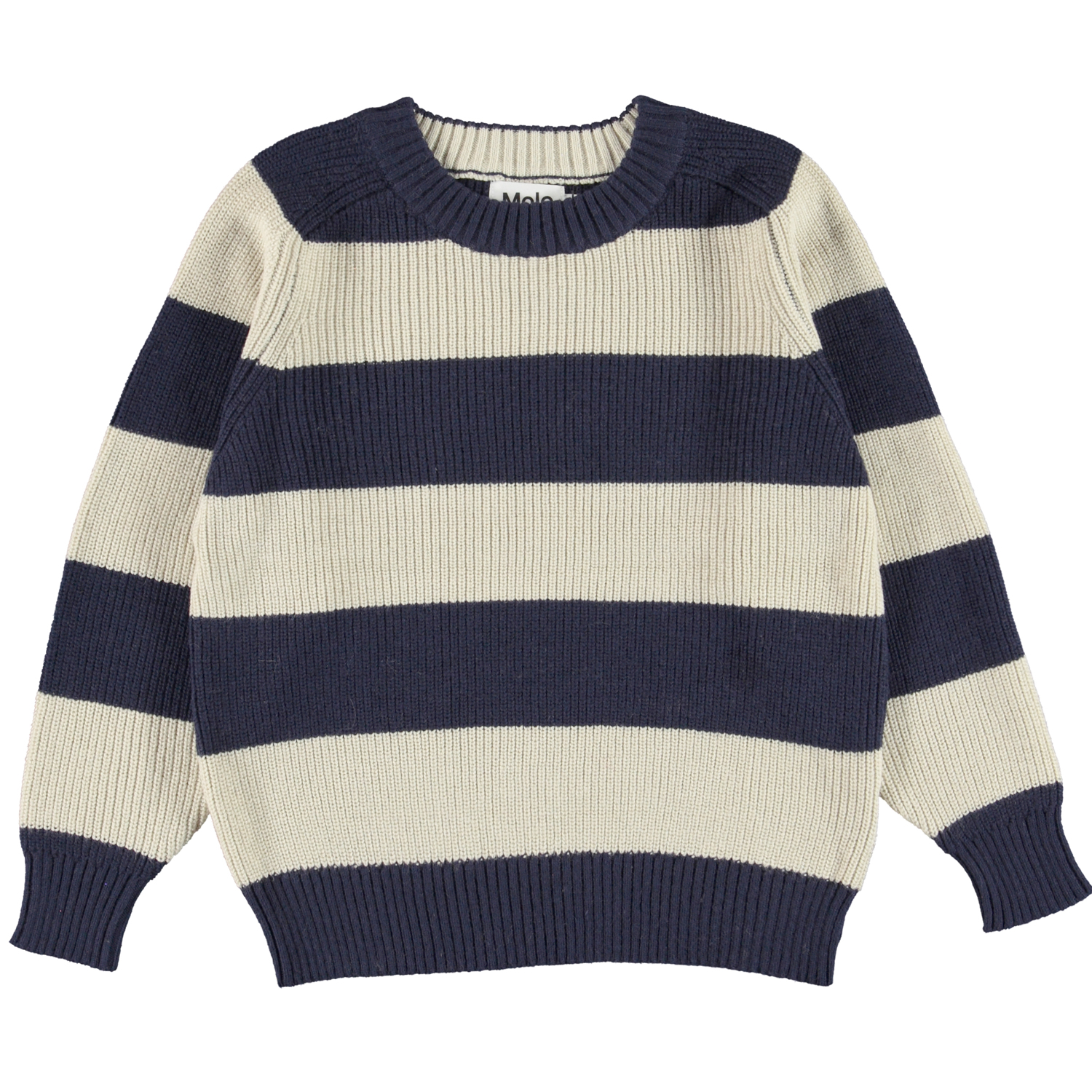 Bosse is een gebreide katoenen wit en blauw gestreepte trui. De gebreide trui heeft een ribboord aan de hals, mouwen en onderkant.