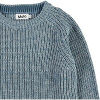 Bosse is een blauw met wit gevlekte gebreide kantoenen trui in een mooi breipatroon. Dit Molo-product is gemaakt van biologisch katoen.