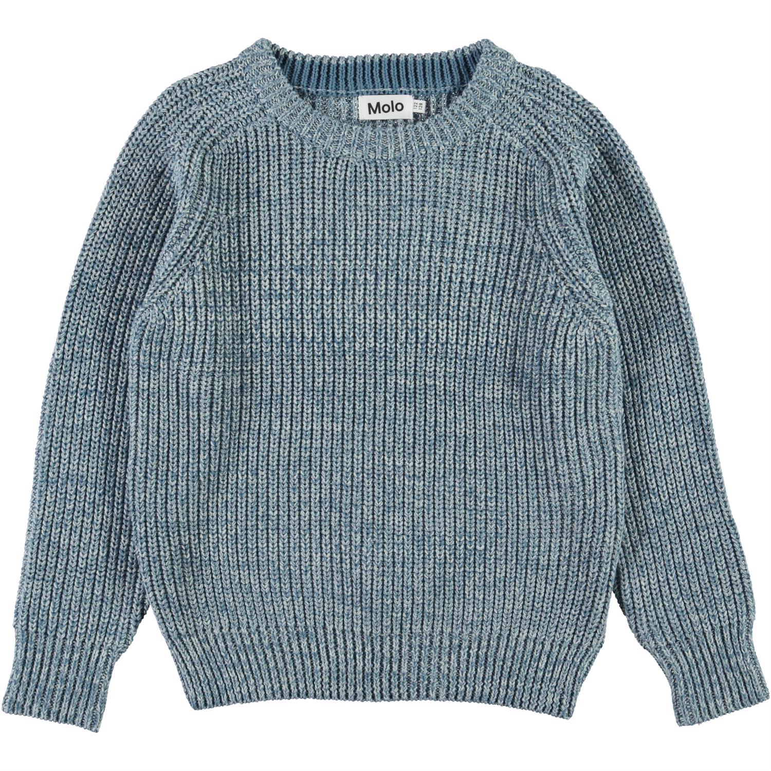 Bosse is een blauw met wit gevlekte gebreide kantoenen trui in een mooi breipatroon. Dit Molo-product is gemaakt van biologisch katoen.