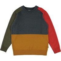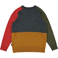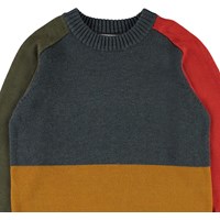 Buzz is een gebreide trui met kleurblokken in rood, groen, geel en grijs. Het heeft een ronde hals met ribboord rond de kraag, mouwen en onderkant.