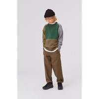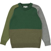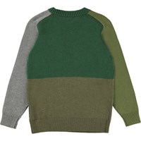 Buzz is een gebreide geblokte trui in grijs en verschillende kleuren groen. De gebreide trui heeft een ribboord aan de hals, mouwen en onderkant.