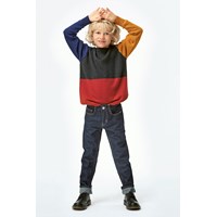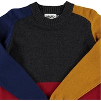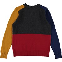 Buzz is een geblokte gebreide trui in rood en grijs aan de voorkant en blauwe en gouden mouwen.