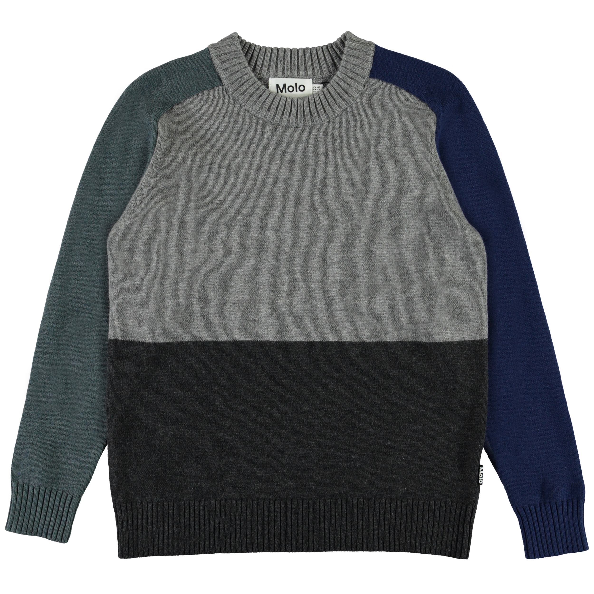 Buzz is een geblokte gebreide trui in twee kleuren grijs aan de voorkant en blauwe en groene mouwen.