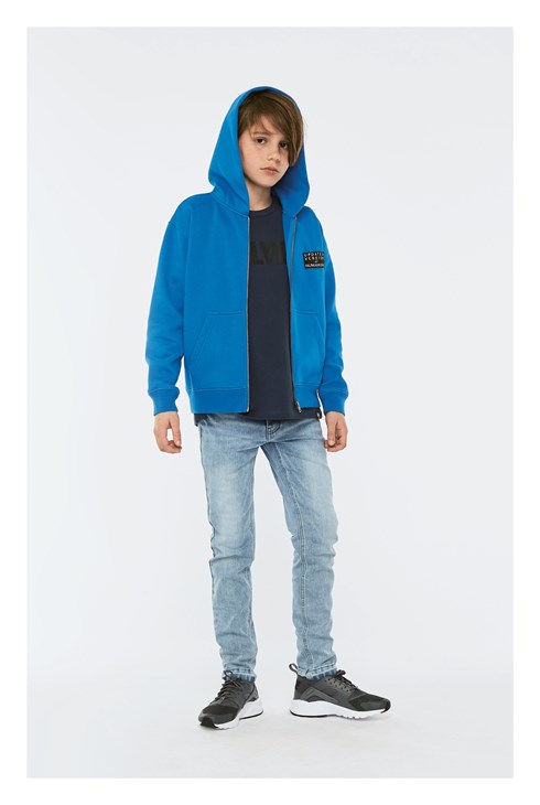 Trui met capuchon, rits en zakken aan de voorkant. De hoodie heeft een patch met tekst aan de linkerkant.