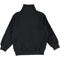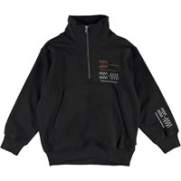 Mads is een coole zwarte trui met een hoge kraag en rits. Het heeft een zak aan de voorkant en 'Interference' op de voorkant en een mouw.