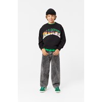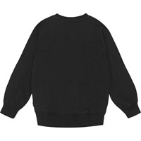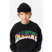 Zwarte biologisch katoenen sweater met een gevoerde binnenkant, waardoor het zacht en warm is om te dragen. De sweater heeft een ruime pasvorm, lange mouwen met lage schoudernaden, een ronde hals, geribbelde boorden en een veelkleurige borduursel op de voorkant met de tekst "Imagine".