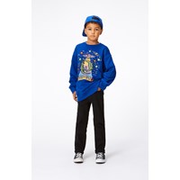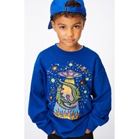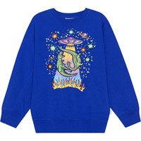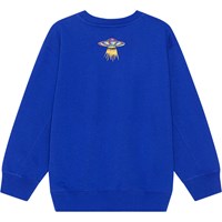 Blauwe sweater met op de voorkant een kleurrijke print . Het is een artistieke fantasie die zich voor onze ogen ontvouwt: er zijn sterren, planeten, vlammen en dinosaurussen die naar een UFO worden gestraald. De sweater heeft een ruimvallende pasvorm met een ronde hals en ribboord rond de hals, de mouwen en de onderkant.