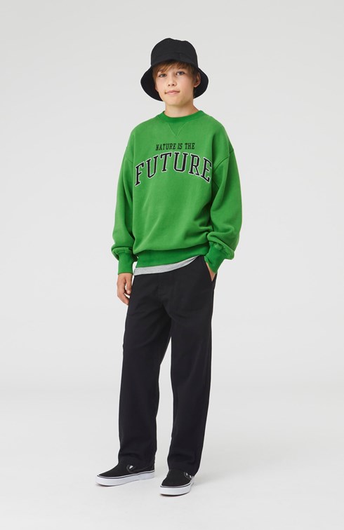 Magni is een groene sweater met op de voorkant de tekst 'Future'. Het heeft wijde mouwen die mooi vallen.