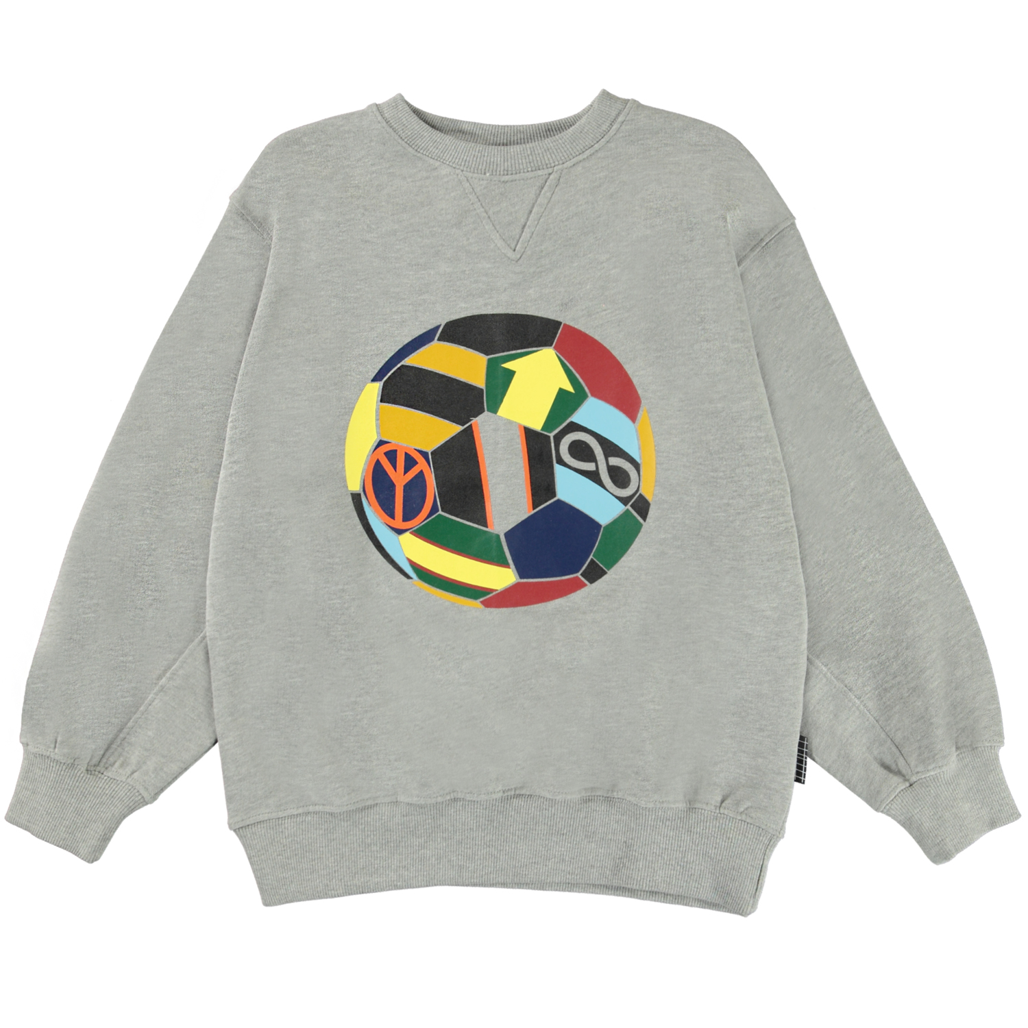 Magni is een grijs gemêleerde sweater met een print van een voetbal in prachtige kleuren.