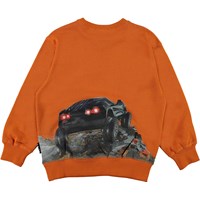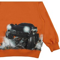 Mann is een oranje sweater met een print van een grote offroad auto op zowel de voor- als de achterkant.